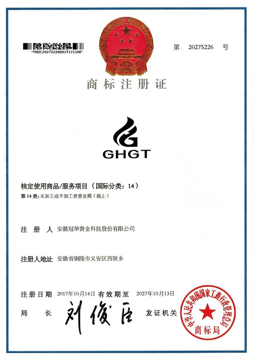 热烈祝贺我公司申请注册的“冠华黄金”商标,获得中华人民共和国国家工商行政管理总局商标局核准注册成功。